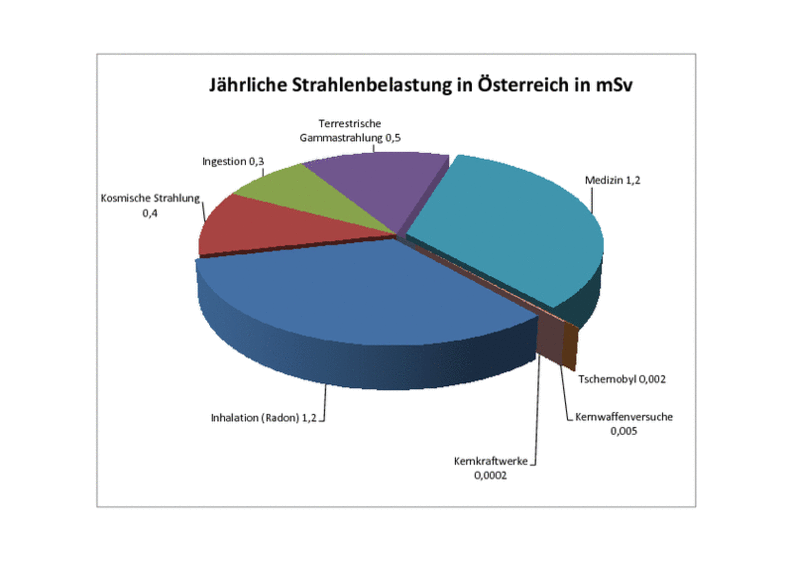 Zum Vergleich: Die jährliche Dosis des durchschnittlichen Österreichers beträgt 3,6 mSv. Diese setzt sich aus natürlichen Quellen, wie terrestrischer und kosmischer Strahlung und künstlichen Quellen, wie z.B. radiologischen Untersuchungen zusammen.