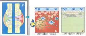 Bild 1: Prinzip: Ein in das Gelenk eingebrachtes Radionuklid (a) bestrahlt die entzündete Gelenkschleimhaut von innen her. Die therapeutische Strahlung hat eine kurze Reichweite von nur wenigen Milimetern, ohne das Knorpelgewebe zu schaedigen. Waehrend der Therapie wird das Radionuklid von den oberflaechlichen Makrophagen aufgenommen (b) und fuehrt im weiteren Verlauf zu einer Rueckbildung der entzuendeten Gelenkschleimhaut (c) mit Rueckgang der Schwellung und Schmerzen.